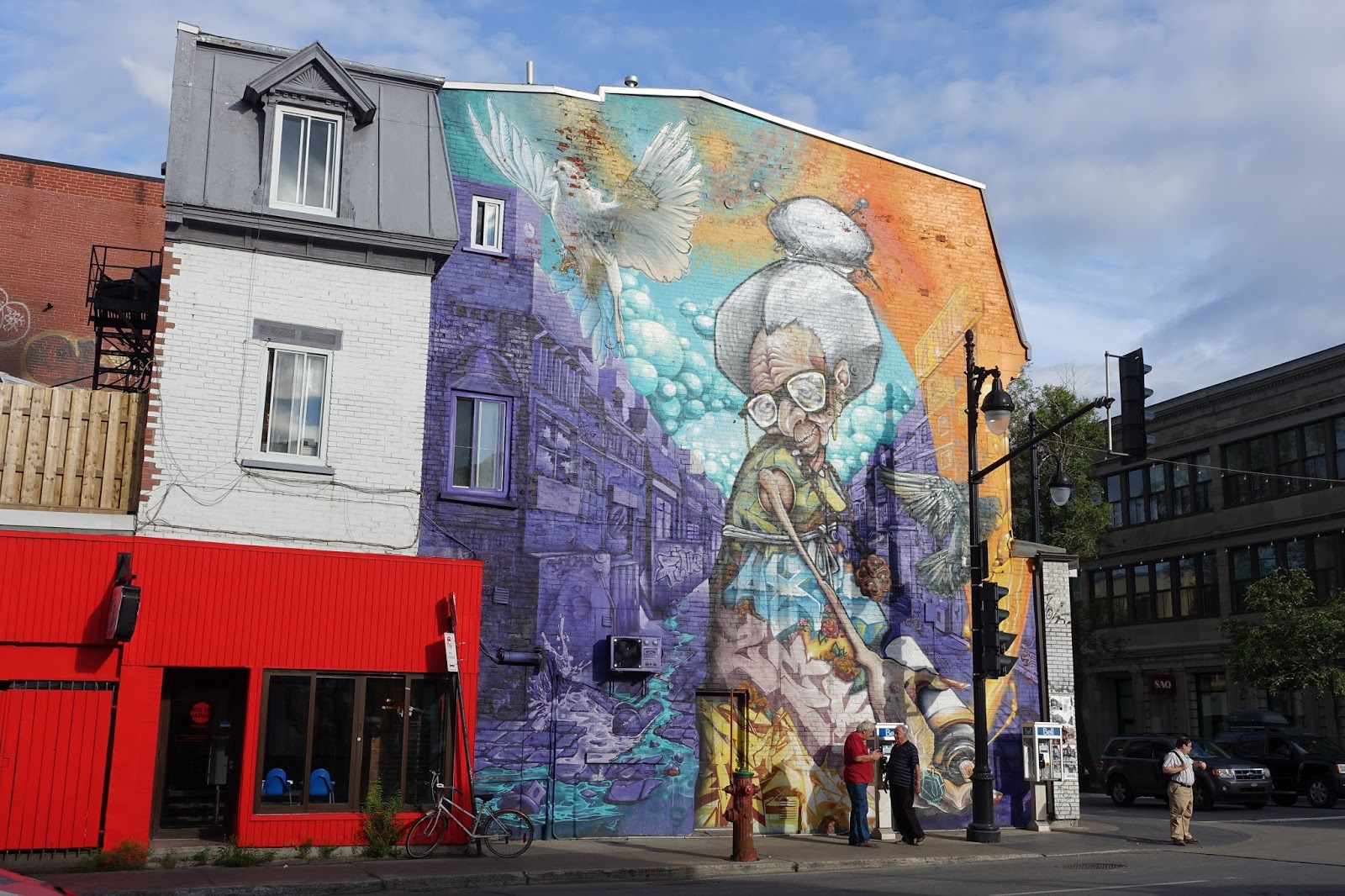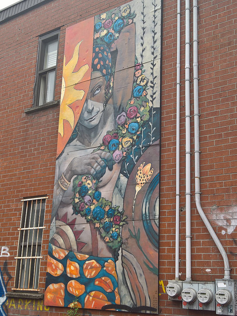 Walking. So far we've walked all around Old Montreal, along much of Boul St Laurent, down St Catherine, on St-Viateur and Parc. We wandered through the high energy of the Place d'Artes during the Jazz Festival and though the Gay Village during MTLenArt. We've got ourselves a Metro/STM pass, so we take the subway or a bus to distant spot and then walk back to our apartment picking different streets. St Laurent is one of our favorite streets partially for the great group of murals that are found along the route. The street is also home to an eclectic mix of shops and restaurants.